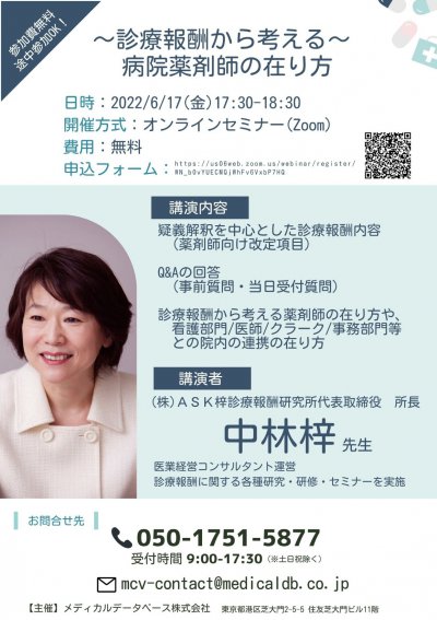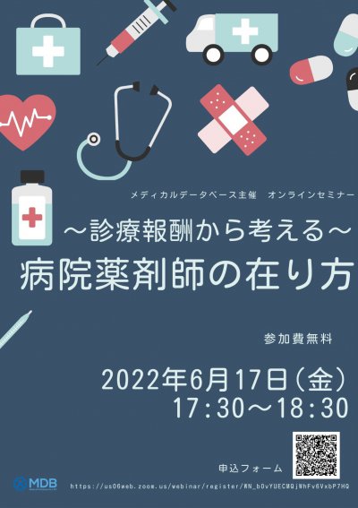 メディカルデータベース株式会社は、2022年6月17日(金)に「~診療報酬から考える~ 病院薬剤師の在り方」をテーマに