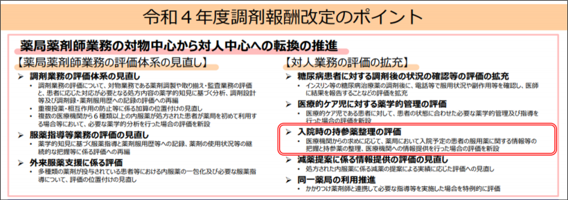 医療機関からの求めに応じて、薬局において入院予定の患者の持参薬の整理を行うとともに、 当該患者の服用薬に関する情報等を一元的に把握し、医療機関に文書により提供した場合の評価(3カ月に1回、50点)*敷地内薬局から敷地内医療機関への情報提供は算定不可