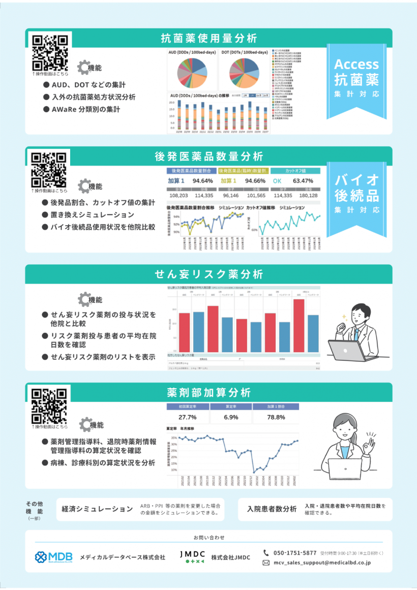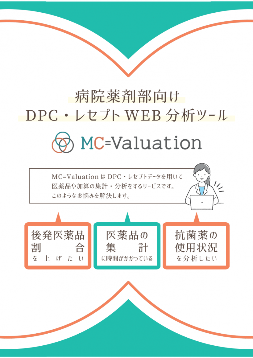 病院薬剤部向けDPCレセプトデータ分析ツールMC=Valuationは抗菌薬分析、後発品分析、せん妄リスク薬分析など、薬剤部に特化した分析ができるツールです。