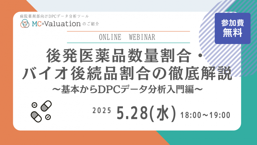 病院薬剤師向けオンラインセミナー「後発医薬品数量割合・バイオ後続品割合の徹底解説 ~基本からDPCデータ分析入門編~」を開催いたします。